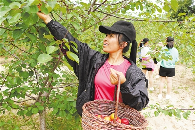 7月3日,游客在彭阳县城阳乡杨塬村采摘红梅杏。2017年以来,城阳乡围绕“四个一”林草产业试验示范工程建设,在杨塬村建成占地600亩的红梅杏生态经济发展示范园区,今年预计红梅杏总产3万公斤,收益60万元左右。记者 党硕 摄