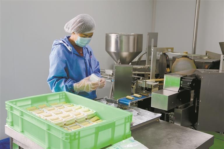 10月27日,在位于彭阳县王洼产业园区的宁夏美禾食品有限公司蛋卷生产车间内,工人给新鲜出炉的蛋卷打包。公司年加工五千吨优质农副产品及食品制造项目是彭阳县今年闽宁协作重点招商引资项目,公司安装三条生产线,加工生产“栖凤”鸡蛋卷、沙琪玛、月饼等休闲食品,计划年产量超两千万元,带动当地就业二十人以上。 记者 张鑫潼 见习记者 王亚玲 摄